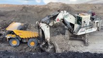 Looking deeper into the background, we can spot more excavators working simultaneously, revealing the intensity and size of this open-pit operation. A full fleet of trucks is constantly rotating through the site, keeping the flow of materials moving and productivity high