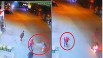 Otomobil ile çarpışan motosiklet sürücüsünün havaya uçtuğu anlar kamerada