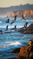 Golden hour washes the coastline in honeyed light as booby birds lift gracefully from the warm rocks. Their wings carve arcs through the glowing sky, each feather catching the amber shimmer of the setting sun. Below, the ocean glitters in gentle waves, rolling toward distant cliffs veiled in soft haze. The entire scene hums with quiet beauty and wild motion.
