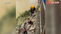 女子受困溪中沙洲 消防人員利用船艇、繩索救起(民眾提供)