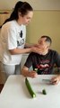 The couple fights over the cucumber to eat