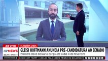 00:18A ministra das relações institucionais Glaise Hoffman reagiu nas redes sociais a reclamação de Alcolumbre contra o governo para tentar amenizar a crise entre o presidente do Senado e o Planalto.