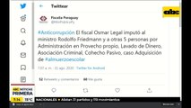 Rodolfo Friedmann confirmó que renuncia a su titularidad en el Ministerio de Agricultura y Ganadería tras la imputación en su contra por parte del Ministerio Público. Agregó que hará “pelea a esta situación” desde la Cámara de Senadores. Aseguró que este es el plan del cartismo para eliminarlo como adversario político.