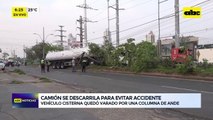 Un choque de camiones de gran porte que estaban transportando soja se produjo sobre la avenida Madame Lynch casi Semidei. Los camiones, que trabajan para una misma empresa, venían uno tras otro y al terminar la curva había desvío del tránsito y allí uno de los camiones embistió en forma violenta en la parte trasera del otro.