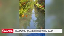 Sular altında kalan bahçesine kayıkla ulaştı