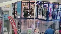01:16Ein Räuber auf der Flucht. Kurz vor dem Ausgang rutscht er weg, prallt gegen ein Regal, rappelt sich auf und verschwindet dann.