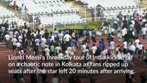 Lionel Messi's tour of India kicked off chaotically as fans ripped up seats and threw them towards the pitch after the Argentina star cut short his walk.