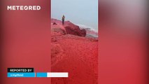 Rainfall on Hormuz Island transformed its Red Beach as iron-rich soil runoff colored the shoreline and waters deep red, drawing wide attention online.