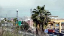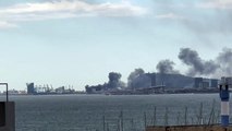 Diez dotaciones de bomberos trabajan en la extinción del incendio de un camión en el puerto de Barcelona