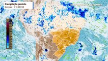Terça-feira, 6 de janeiro: Previsão de precipitação, nebulosidade e pressão a nível médio do mar entre a terça (6) e quinta-feira (8). É possível notar o enfraquecimento da Zona de Convergência do Atlântico Sul a partir desta quarta (7) e o avanço de uma frente fria sobre a Região Sul do Brasil.