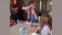 Check this out she fell again, and there's there's there's snow in her glasses