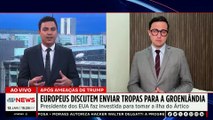 00:00Agora o Fabrício Nights é quem tem informação do governo americano que disse que o controle dos Estados Unidos sobre a Groenlândia é vital para o projeto da Cúpula Dourada de Sistema de Defesa Aérea e Antimísseis.