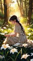 A smiling girl walks gently through wide meadows, bathed in warm sunlight, capturing a carefree, peaceful, and joyful mood.