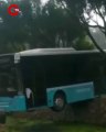Freni boşalan otobüs, duvarda asılı kaldı