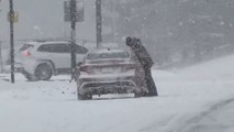 Driver struggles with wiper during heavy snowstorm in Rochester, New York, USA