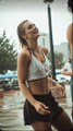 Tall Woman hug to Reporter