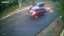 Carro passa por cima de tampa de bueiro 'solta', quase capota e atinge árvore; vídeo mostra acidente