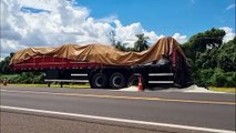 Carga de arroz permanece na rodovia após caminhão pegar fogo na BR-277, em Santa Tereza do Oeste