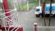 Coletor de lixo é flagrado nadando em água de chuva em rua alagada de Paranaguá