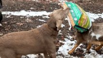 Goat's Head Gets Caught in Feed Bag, Dog Comes to the Rescue