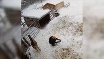 Un gato avanza sigiloso en modo caza por el patio y un cachorro aparece para arruinarle el plan