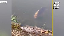 تمساح عملاق يأكل سمكة قرش في فيديو مرعب
