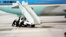 اضغط لمشاهدة الفيديو: عطل مفاجئ بعربة سلم طائرة ترامب، وحراسه يهرولون لإنقاذ الموقف