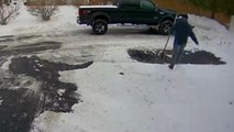 The quick mishap, caught clearly on the security camera, turns an ordinary day into a classic winter wipeout moment.
