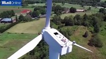 بالفيديو... رجل يتشمس فوق توربينات الهواء الضخمة