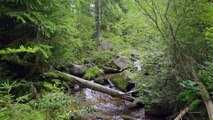 This recording captures a small forest stream flowing through moss-covered rocks and exposed roots deep in a woodland valley. Water moves continuously through natural stone channels, creating a rich and detailed stream texture with gentle cascades and soft splashes.