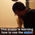 رجل يعلم الجرو كيفية نزول الدرج .. فيديو