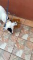 Shih tzu puppy teasing the other dog