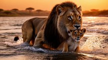 Lion Pulls Cub From River Current
