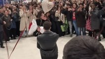 Rui arrives with his bag and greets his loved ones immediately by smiling and embracing them.