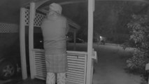 As he raises the mug over the grill, the setup suddenly flares, and the mug catches fire. He immediately tries to put out the flames on the mug.