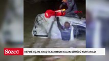 Nehre uçan araçta mahsur kalan sürücü, ekipler tarafından halatla kurtarıldı