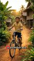 A young boy happily rides his bicycle down a peaceful village road during sunset, with the golden light casting long shadows. Coconut trees gently sway in a soft breeze as