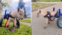 Special needs baby goat walks with custom wheelchair after being born with deformities