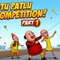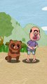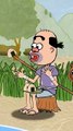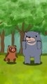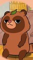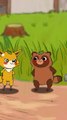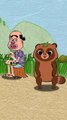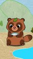 Sly Little Bear and Other Bears, featuring several animal characters in a natural setting. Characters: The image includes a tanuki (raccoon dog) character with a leaf on its head, a larger duck, and three smaller ducklings. Setting: The scene takes place outdoors in a grassy area with tall green reeds and tree trunks visible in the background. Action/Objects: The tanuki is peeking from behind the tall grass with a happy expression. The large duck is standing on a broken, dark-colored object, possibly a shell or helmet. The three ducklings are walking in a line behind the larger duck.