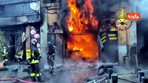 Incendio in 4 magazzini nella periferia di Napoli, Vigili del fuoco al lavoro con ruspe