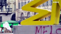 Torino, in piazza San Carlo compare la scritta "Meloni criminale"