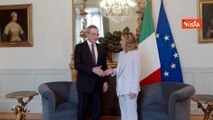 Draghi ricevuto da Meloni a Palazzo Chigi, il saluto con stretta di mano e bacio sulle guance