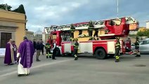 Funerali di Omar Masia, la bara trasportata dall'autoscala dei vigili del fuoco