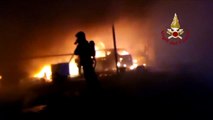 La notte di fuoco nel deposito di Tir, pompieri al lavoro fino all'alba