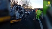 Assalto ai portavalori sulla 131: operai Anas al lavoro fra i mezzi incendiati dopo l'inferno
