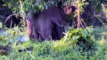 Une éléphante aide son petit coincé entre deux arbres