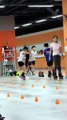 Une fillette fait du roller sur une jambe