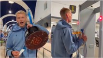 Orri Oskarsson y el habitual 'troleo' con la Copa en el control de seguridad del aeropuerto