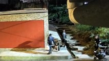 Caçamba se solta de caminhão, cai na pista e quase atinge motociclista; câmera registra acidente