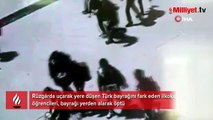 Öğrencilerin bayrak hassasiyeti! Düşen bayrağı yerden alıp öptü